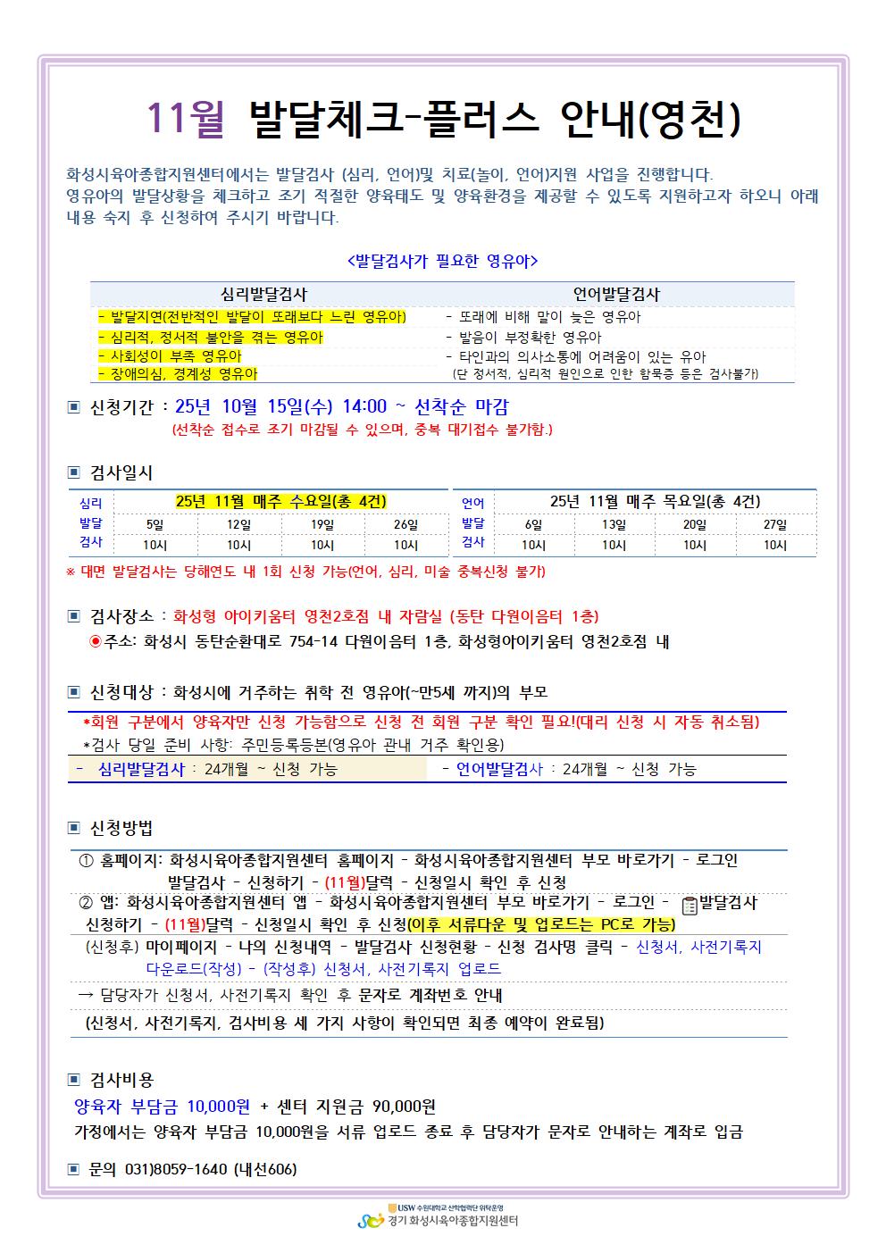 1. 화성시 관내 거주 영유아(주민등록등본 확인)와 주양육자만 이용 가능. 2. 신청하신 검사 일시는 변경이 불가능. 3. 신청 후, 신청서와 사전기록지를 마이페이지에서 다운로드 후 작성하여 업로드. 4. 검사 및 치료 시 늦을 경우, 다음 검사 및 치료일정이 있음에 따라 검사 종료시간은 동일 함. 5. 양육자 부담금은 영유아명과 동일하게 입금 6. 장소: 화성시 동탄 다원이음터 1층(화성형 아이키움터 영천2호점 내 자람실) |
