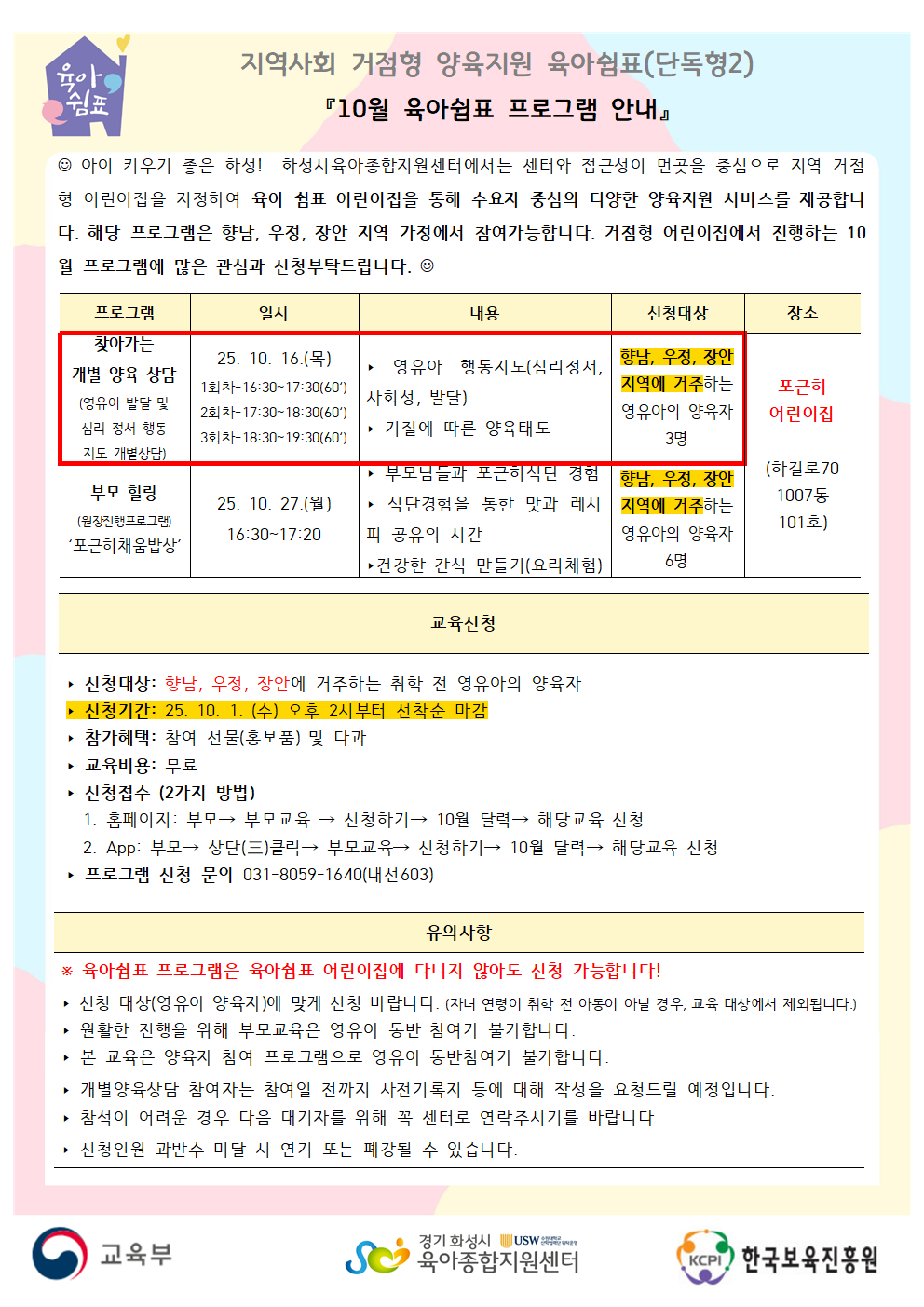 - 육아쉼표 프로그램은 육아쉼표 어린이집에 다니지 않아도 신청 가능합니다. - 부모 교육은 양육자 참여 프로그램으로 영유아 동반참여가 불가합니다. - 참석이 어려운 경우 다음 대기자를 위해 꼭 센터로 연락주시기를 바랍니다. - 신청인원이 미달 시 연기 또는 폐강될 수 있습니다. |