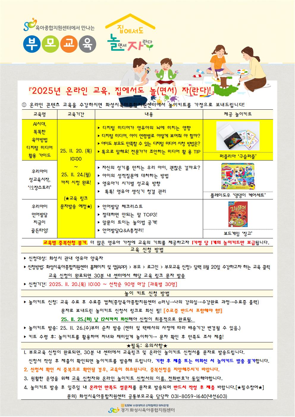 1. 교육별 중복신청 불가합니다. 2. 1가정 당 1개의 놀이키트만 보급되며, 중복신청 확인 시 자동취소됩니다. 3. 교육신청 후 30분 내 교육링크 및 온라인 놀이키트 신청서를 문자로 발송드립니다. 4.이외 자세한 사항은 신청자에 한해 안내드립니다. |