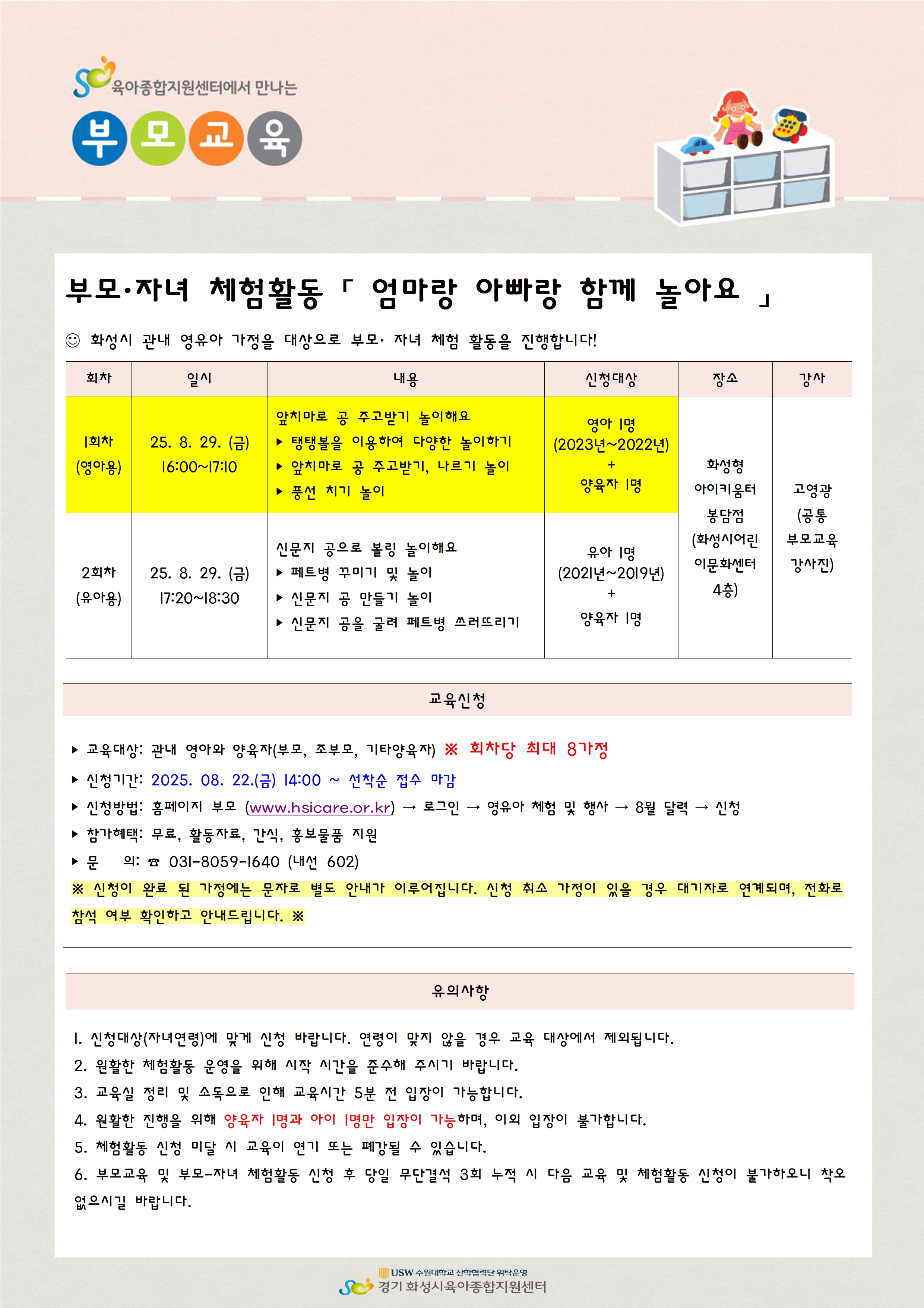 1. 신청대상(자녀연령)에 맞게 신청 바랍니다. 연령이 맞지 않을 경우 교육 대상에서 제외됩니다. 2. 원활한 체험활동 운영을 위해 시작 시간을 준수해 주시기 바랍니다. 3. 교육실 정리 및 소독으로 인해 교육시간 5분 전 입장이 가능합니다. 4. 원활한 진행을 위해 양육자 1명과 아이 1명만 입장이 가능하며, 이외 입장이 불가합니다. 5. 체험활동 신청 미달 시 교육이 연기 또는 폐강될 수 있습니다. 6. 신청 후 당일 무단결석 3회 누적 시 다음 체험활동 신청이 불가하오니 착오 없으시길 바랍니다. |