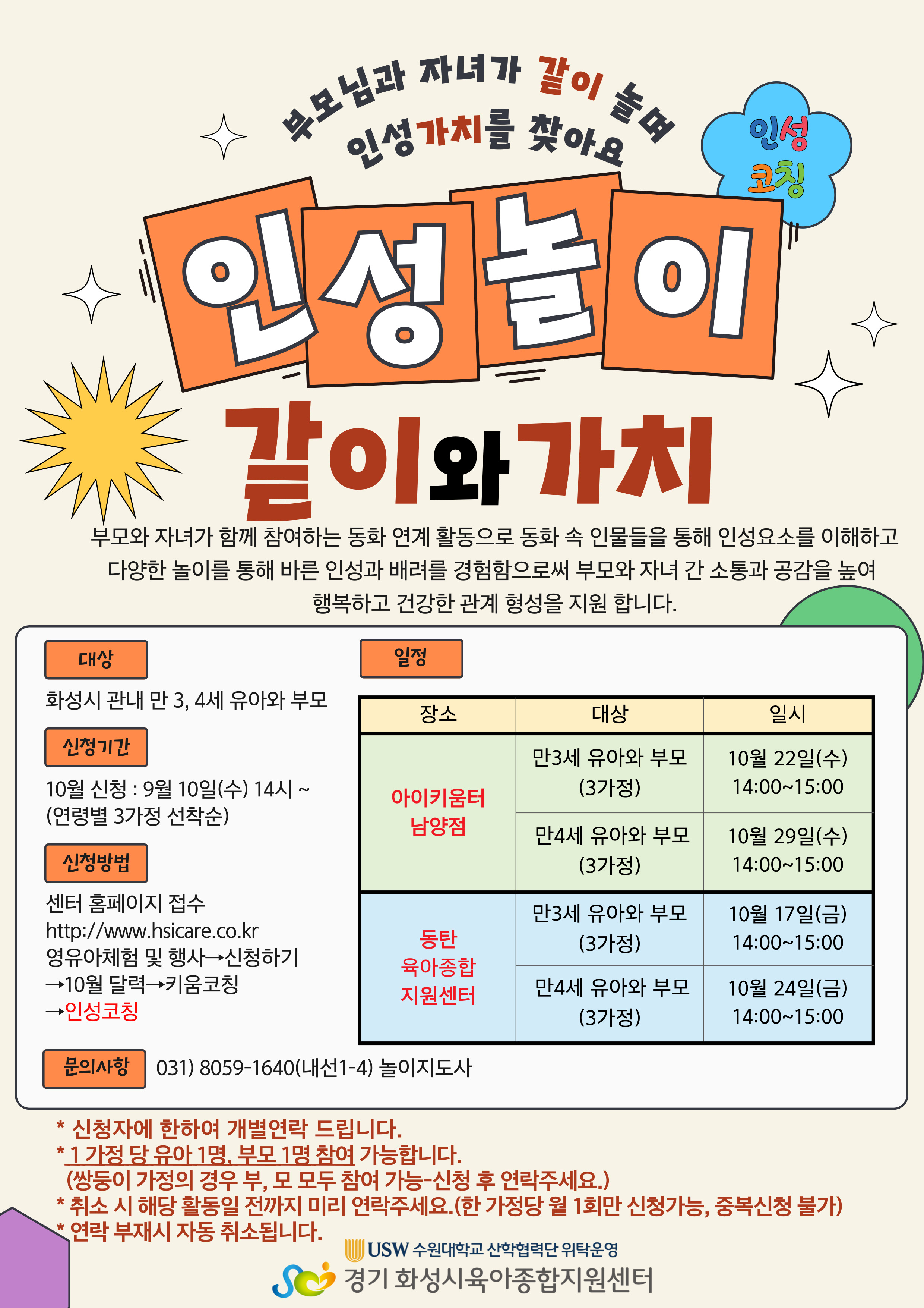 1. 1가정 당 유아 1명, 부모 1명 참여 가능합니다.(쌍둥이 가정의 경우 부, 모 모두 참여 가능 - 신청 후 연락주세요.) 2. 취소 시 해당 예약일 전까지 미리 연락주세요.(한 가정당 월 1회만 신청가능, 중복신청 불가) 3. 신청 후 연락 부재 시 자동 취소됩니다. |