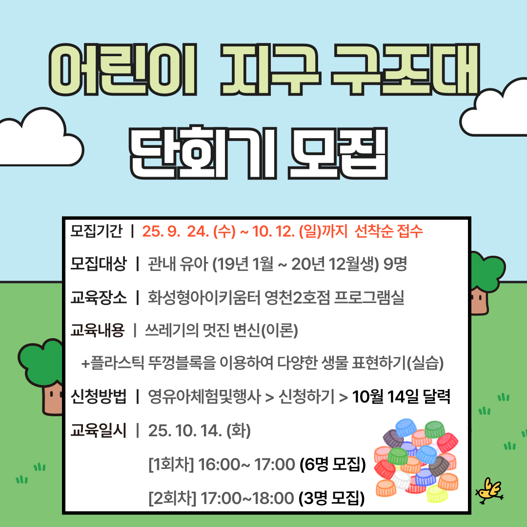 - 단회기로 1회만 참여 하는 프로그램입니다. - 어린이 지구 구조대는 유아(2019년 1월 ~ 2020년 12월)를 대상으로 진행합니다. - 양육자와 분리되어 유아만 활동이 진행되며, 분리가 가능한 유아만 신청 부탁드립니다. |