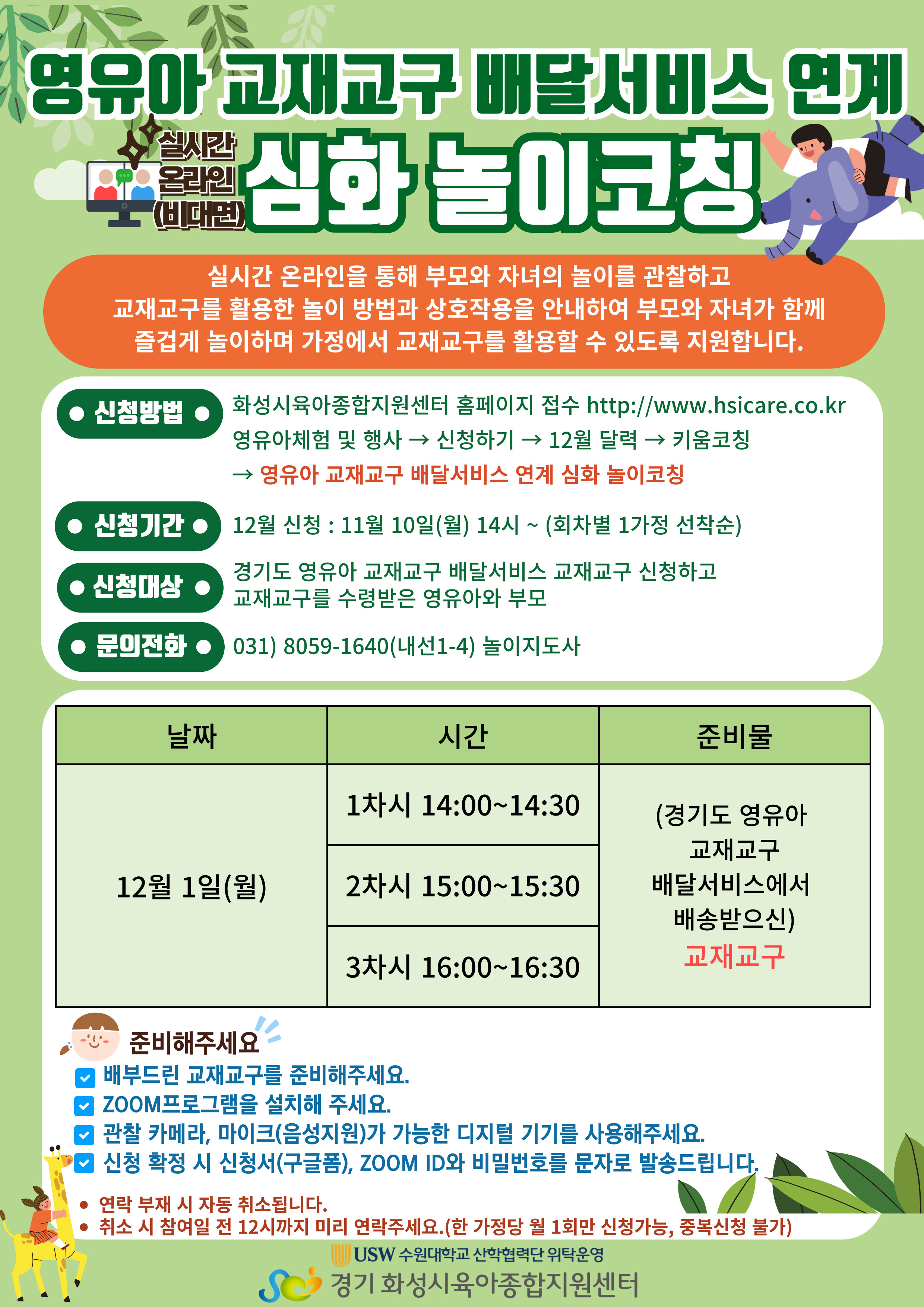 1. 경기도 영유아 교재교구 배달서비스를 이용하여 교재교구를 수령한 가정만 신청 가능합니다. 2. 신청 후 연락 부재 시 자동 취소됩니다. 3. 취소 시 해당 예약일 전까지 미리 연락주세요. (한 가정당 월 1회만 신청가능, 중복신청 불가) |