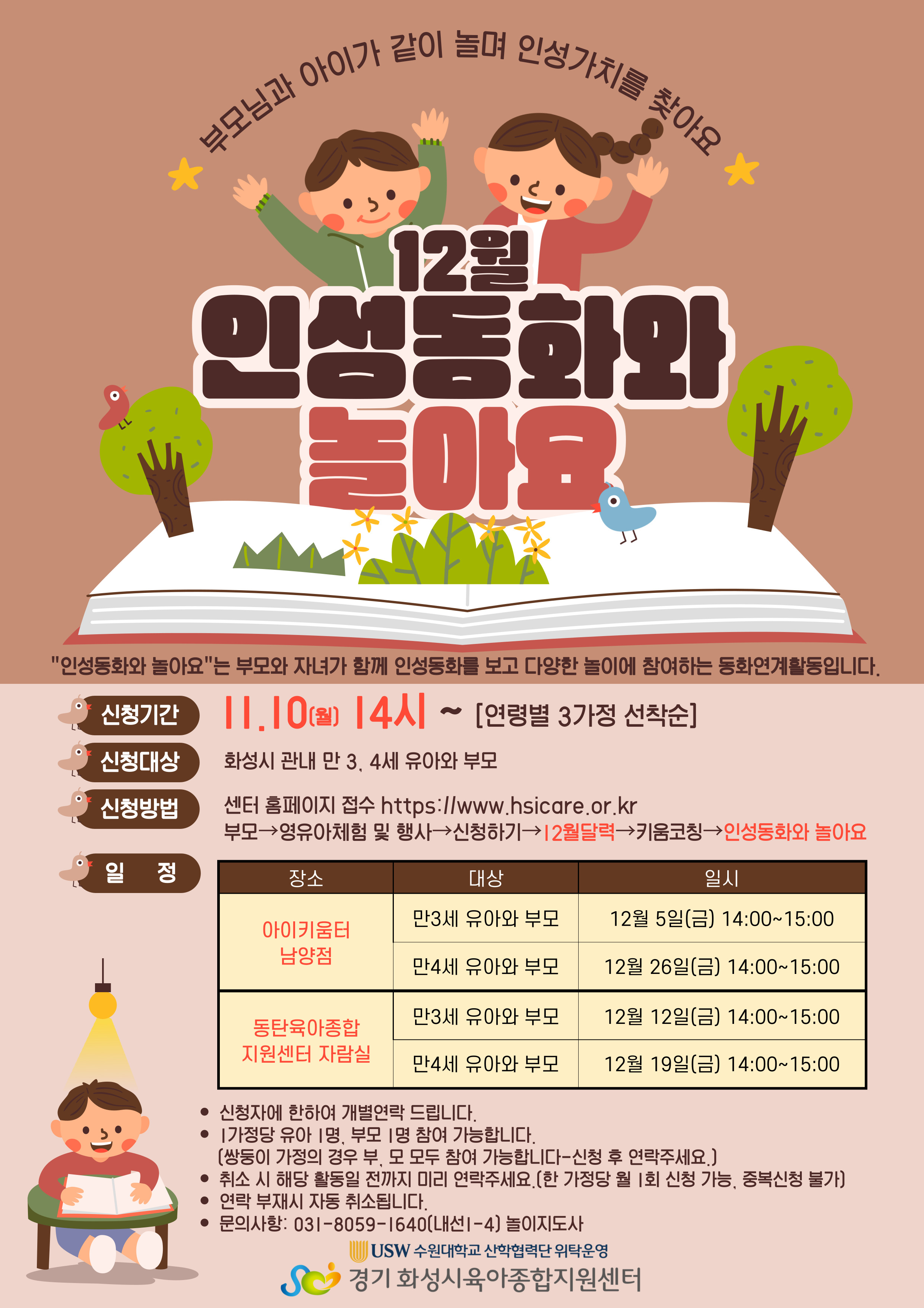 1. 1가정 당 유아 1명, 부모 1명 참여 가능합니다.(쌍둥이 가정의 경우 부, 모 모두 참여 가능 - 신청 후 연락주세요.) 2. 취소 시 해당 예약일 전까지 미리 연락주세요.(한 가정당 월 1회만 신청가능, 중복신청 불가) 3. 신청 후 연락 부재 시 자동 취소됩니다. |