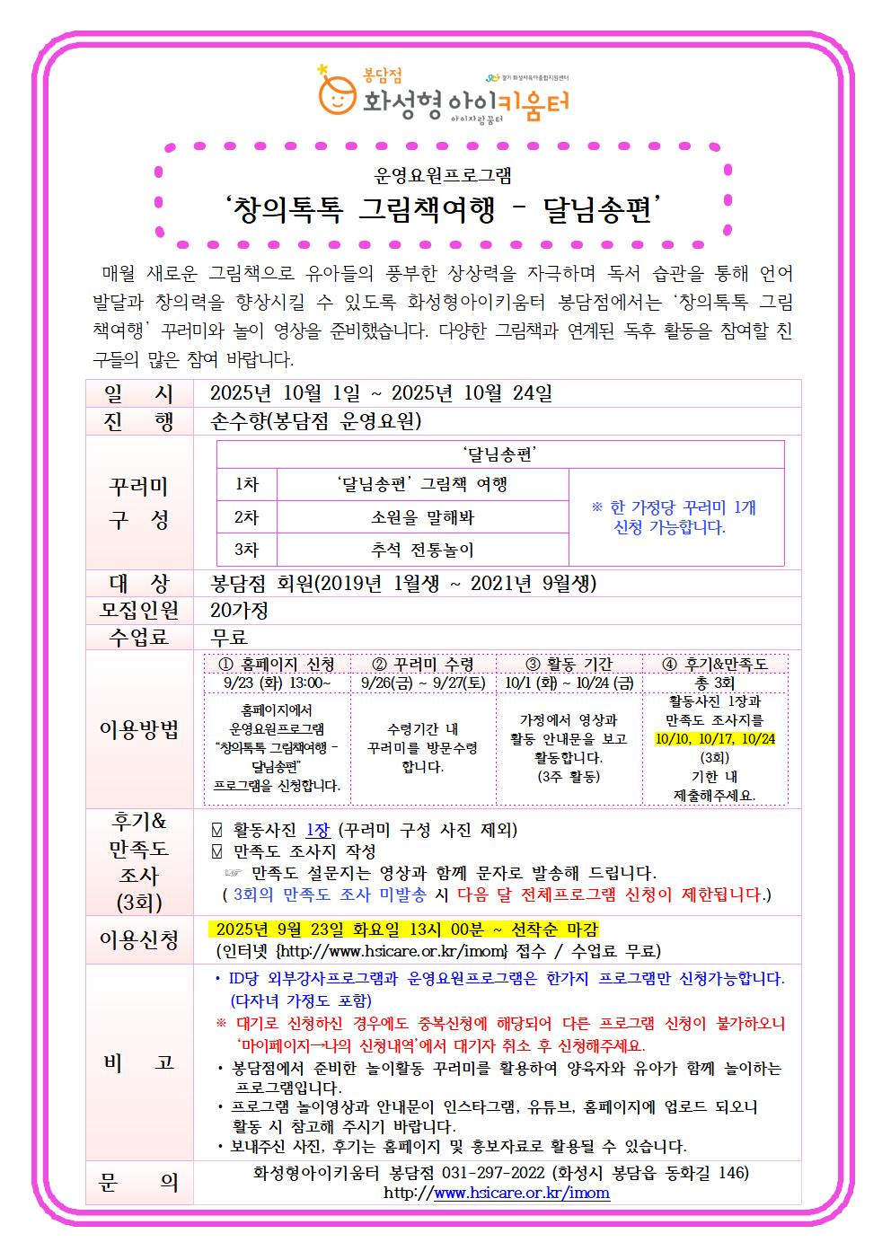 *  화성형아이키움터 봉담점 프로그램은 부모인증 받은 봉담점 회원에 한하여 참여 가능합니다.