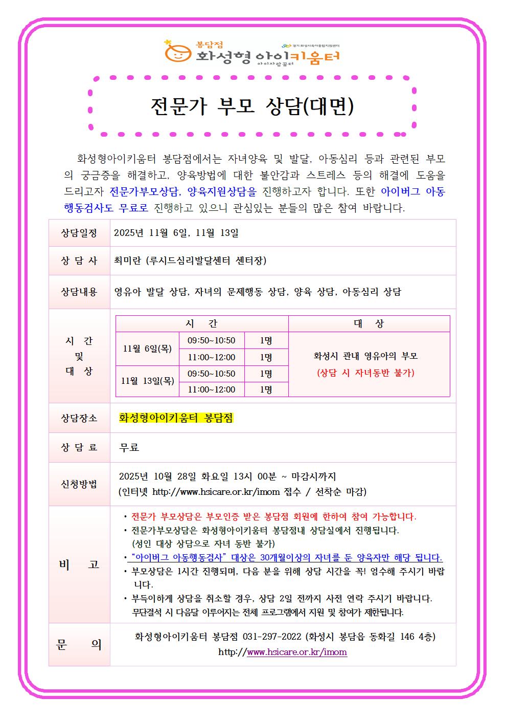 | 대상 | 영유아발달상담, 자녀의 문제행동상담, 양육상담, 아동심리 |