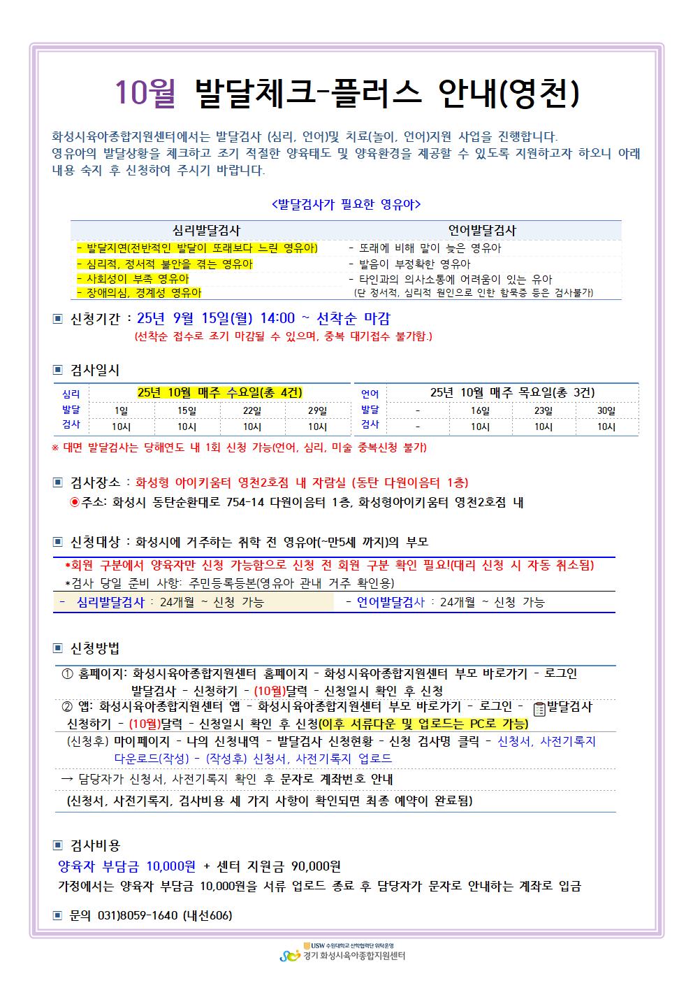 1. 화성시 관내 거주 영유아(주민등록등본 확인)와 주양육자만 이용 가능. 2. 신청하신 검사 일시는 변경이 불가능. 3. 신청 후, 신청서와 사전기록지를 마이페이지에서 다운로드 후 작성하여 업로드. 4. 검사 및 치료 시 늦을 경우, 다음 검사 및 치료일정이 있음에 따라 검사 종료시간은 동일 함. 5. 양육자 부담금은 영유아명과 동일하게 입금 6. 장소: 화성시 동탄 다원이음터 1층(화성형 아이키움터 영천2호점 내 자람실) |