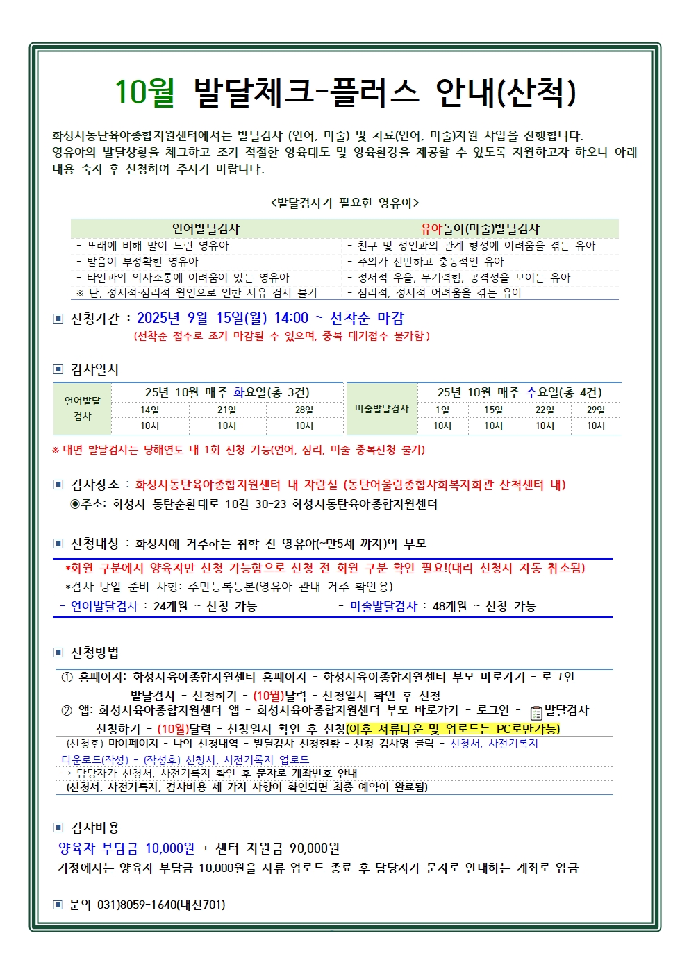 1. 화성시 관내 거주 영유아(주민등록등본 확인)와 주양육자만 이용 가능. 2. 신청하신 검사 일시는 변경이 불가능. 3. 신청 후, 신청서와 사전기록지를 마이페이지에서 다운로드 후 작성하여 업로드. 4. 검사 및 치료 시 늦을 경우, 다음 검사 및 치료일정으로 인하여, 검사 종료시간은 동일 함. 5. 양육자 부담금은 영유아명과 동일하게 입금. 6. 장소: 화성시동탄육아종합지원센터 내 자람실 (주소:경기도 화성시 동탄순환대로 10길 30-23 동탄어울림종합사회복지관 산척센터 내 1층) |