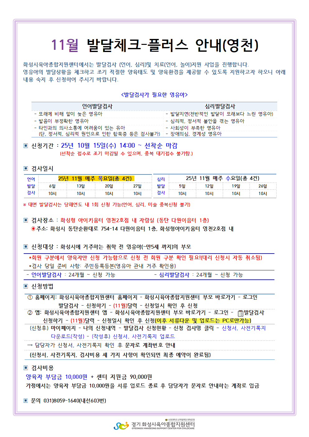 1. 화성시 관내 거주 영유아(주민등록등본 확인)와 주양육자만 이용 가능. 2. 신청하신 검사 일시는 변경이 불가능. 3. 신청 후, 신청서와 사전기록지를 마이페이지에서 다운로드 후 작성하여 업로드. 4. 검사 및 치료 시 늦을 경우, 다음 검사 및 치료일정이 있음에 따라 검사 종료시간은 동일 함. 5. 양육자 부담금은 영유아명과 동일하게 입금 6. 장소: 화성시 동탄 다원이음터 1층(화성형 아이키움터 영천2호점 내 자람실) 7. 검사대상이 아닌 영유아 신청 시 취소될 수 있음. |