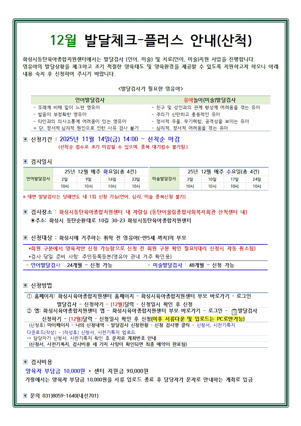 1. 화성시 관내 거주 영유아(주민등록등본 확인)와 주양육자만 이용 가능. 2. 신청하신 검사 일시는 변경이 불가능. 3. 신청 후, 신청서와 사전기록지를 마이페이지에서 다운로드 후 작성하여 업로드. 4. 검사 및 치료 시 늦을 경우, 다음 검사 및 치료일정으로 인하여, 검사 종료시간은 동일 함. 5. 양육자 부담금은 영유아명과 동일하게 입금. 6. 장소: 화성시동탄육아종합지원센터 내 자람실 (주소:경기도 화성시 동탄순환대로 10길 30-23 동탄어울림종합사회복지관 산척센터 내 1층) |