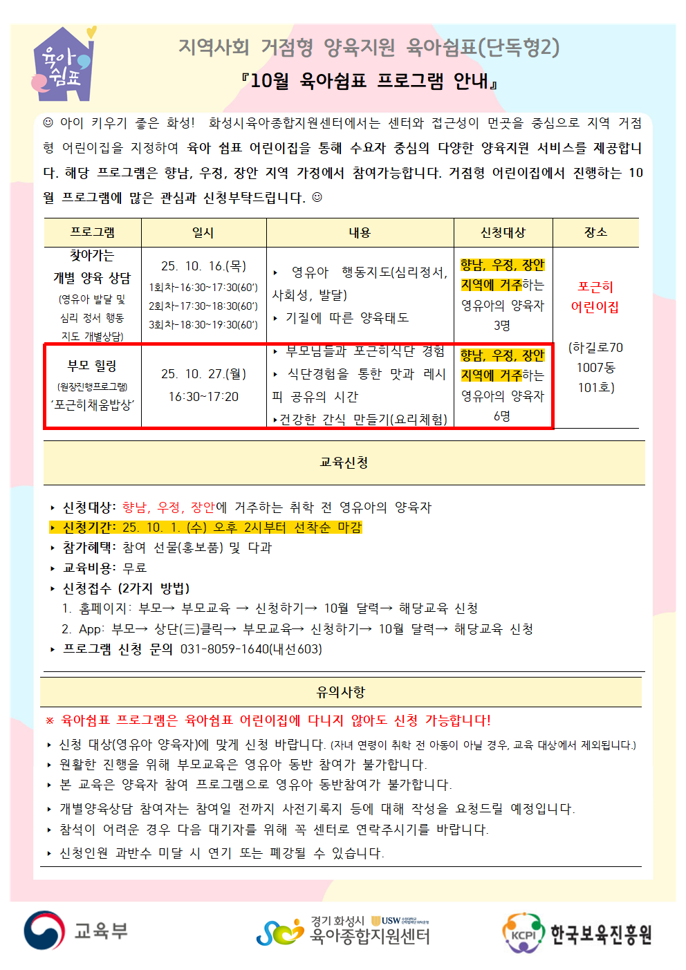 - 육아쉼표 프로그램은 육아쉼표 어린이집에 다니지 않아도 신청 가능합니다. - 부모 교육은 양육자 참여 프로그램으로 영유아 동반참여가 불가합니다. - 참석이 어려운 경우 다음 대기자를 위해 꼭 센터로 연락주시기를 바랍니다. - 신청인원이 미달 시 연기 또는 폐강될 수 있습니다. |