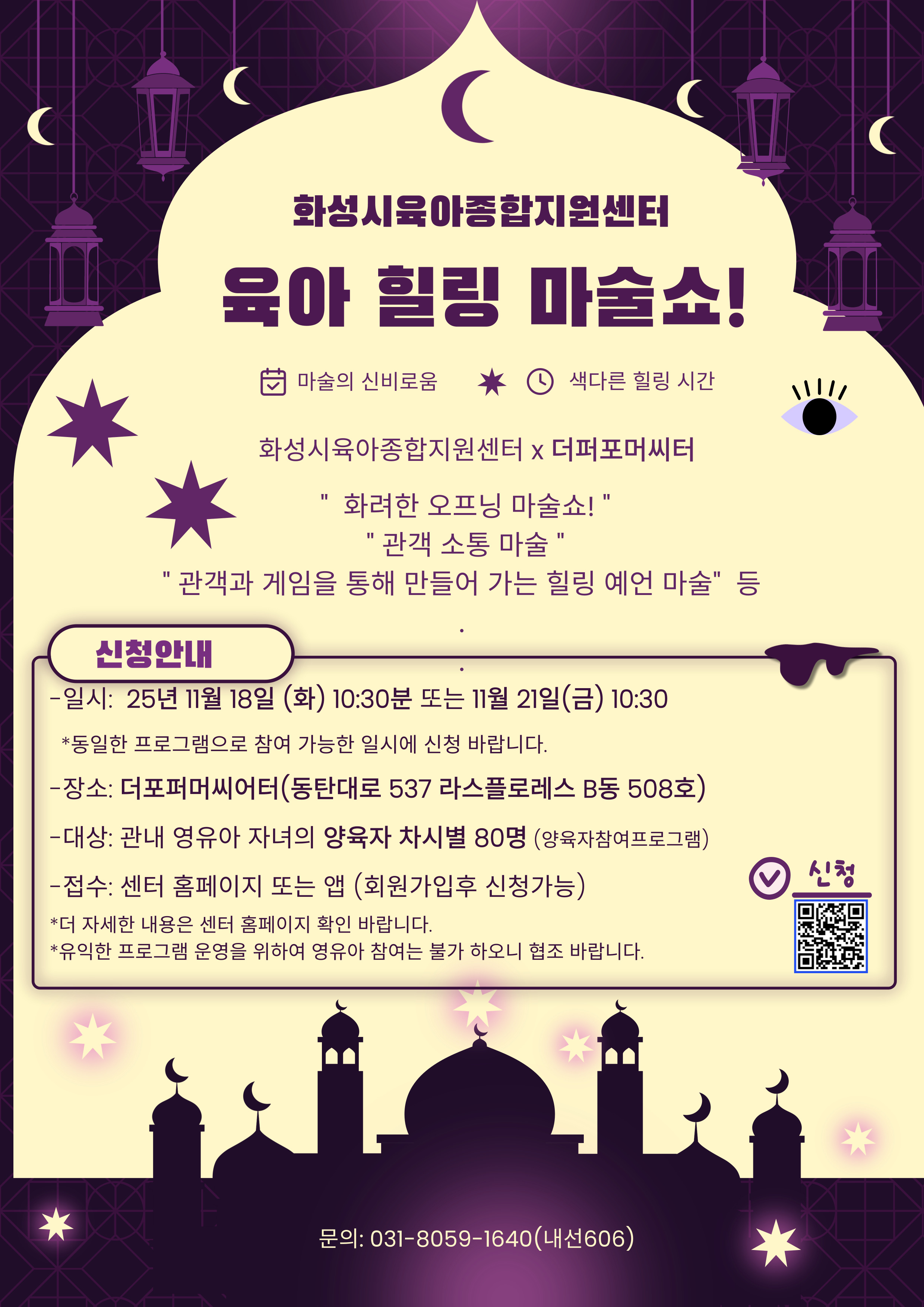 1. 본 공연은 관내 영.유아 자녀를 둔 양육자를 대상으로 진행되는 공연 입니다. 2. 신청을 원할 시 센터 홈페이지 가입 후 신청이 가능 합니다. (신청 확인 후 입장이 가능 합니다.)*동반인도 반드시 홈페이지 가입 후 신청해 주세요* 3. 당일 참석이 어려운 경우 반드시 마이페이지를 통한 신청 취소 및 센터로 유선 연락 바랍니다. 031-8059-1640(내선 606) 4. 신청자 접수는 공연시작 30분전 입장은 15분전 부터 가능 합니다. 입장하신 후 좌석은 자유롭게 착석하시면 됩니다. 5. 양육자(성인) 대상 힐링 마술 공연으로 영.유아 동반 참여는 불가 합니다. 6. 현장 참여율에 따라 착석 제한 좌석이 발생 할 수 있습니다. 7. 공연 참여 시 공연 시간은 주차 등록이 가능 하오니 차량 번호 숙지 바랍니다. 8. 공연장 내 음식물 반입은 불가 합니다. 문의) 031-8059-1640(내선606) |