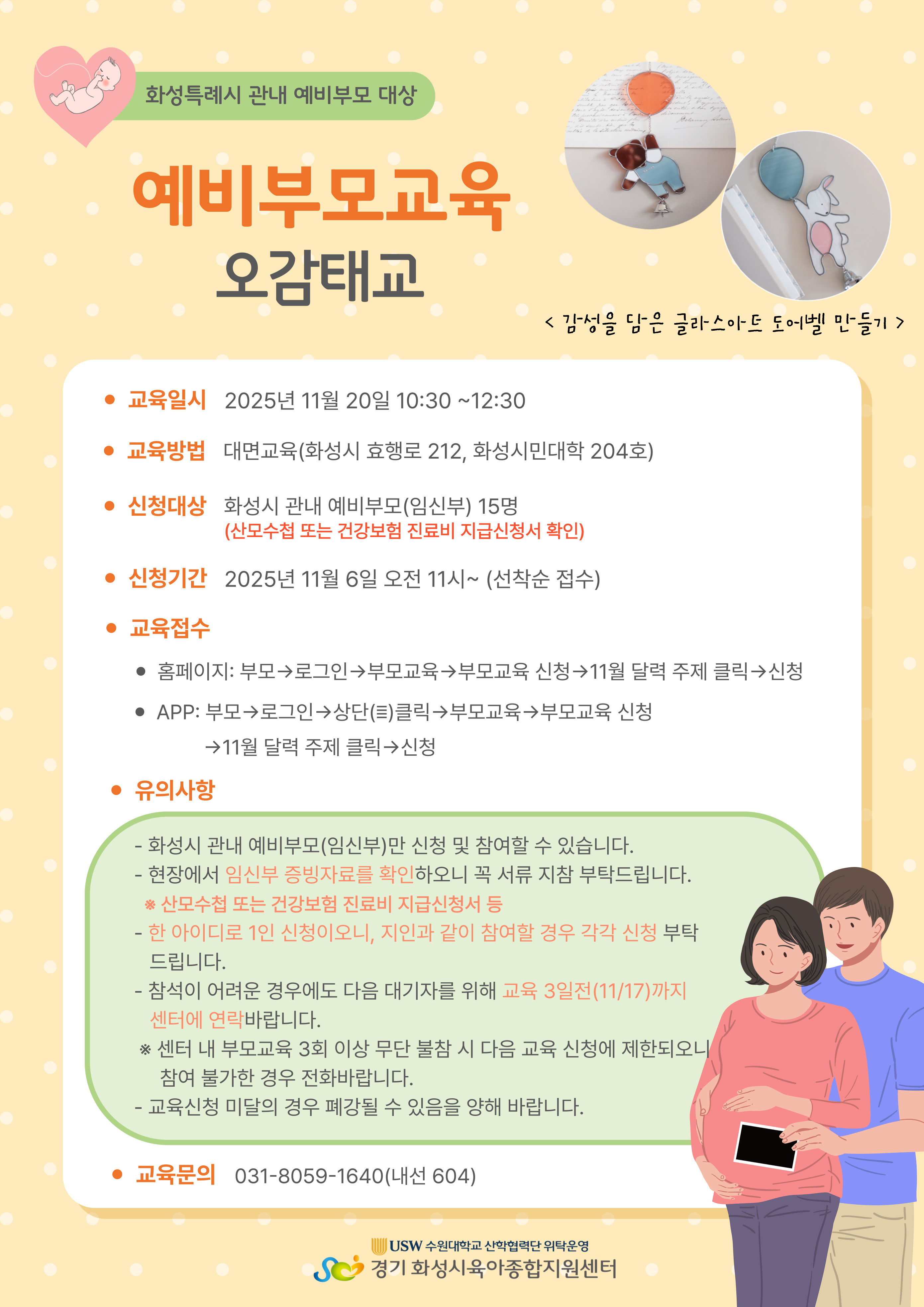 1. 현장에서 임신부 증빙자료를 확인하오니 꼭 서류 지참 부탁드립니다. 2. 한 아이디로 1인 신청이오니, 지인과 같이 참여할 경우 각각 신청 부탁드립니다. 3. 참석이 어려운 경우에는 다음 대기자를 위해 교육 3일전(11/17)까지 센터로 연락바랍니다. |