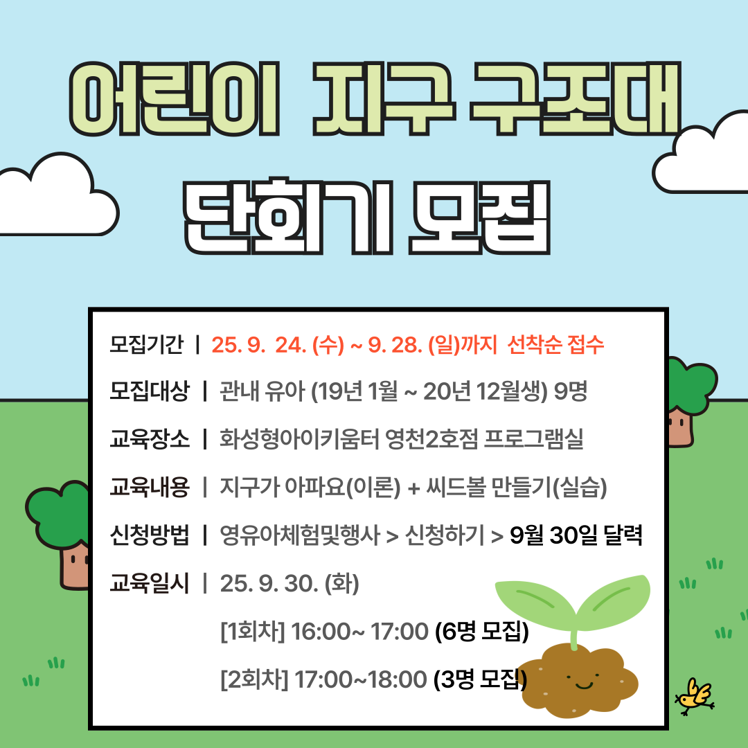 - 단회기로 1회만 참여 하는 프로그램입니다. - 어린이 지구 구조대는 유아(2019년 1월 ~ 2020년 12월)를 대상으로 진행합니다. - 양육자와 분리되어 유아만 활동이 진행되며, 분리가 가능한 유아만 신청 부탁드립니다. |