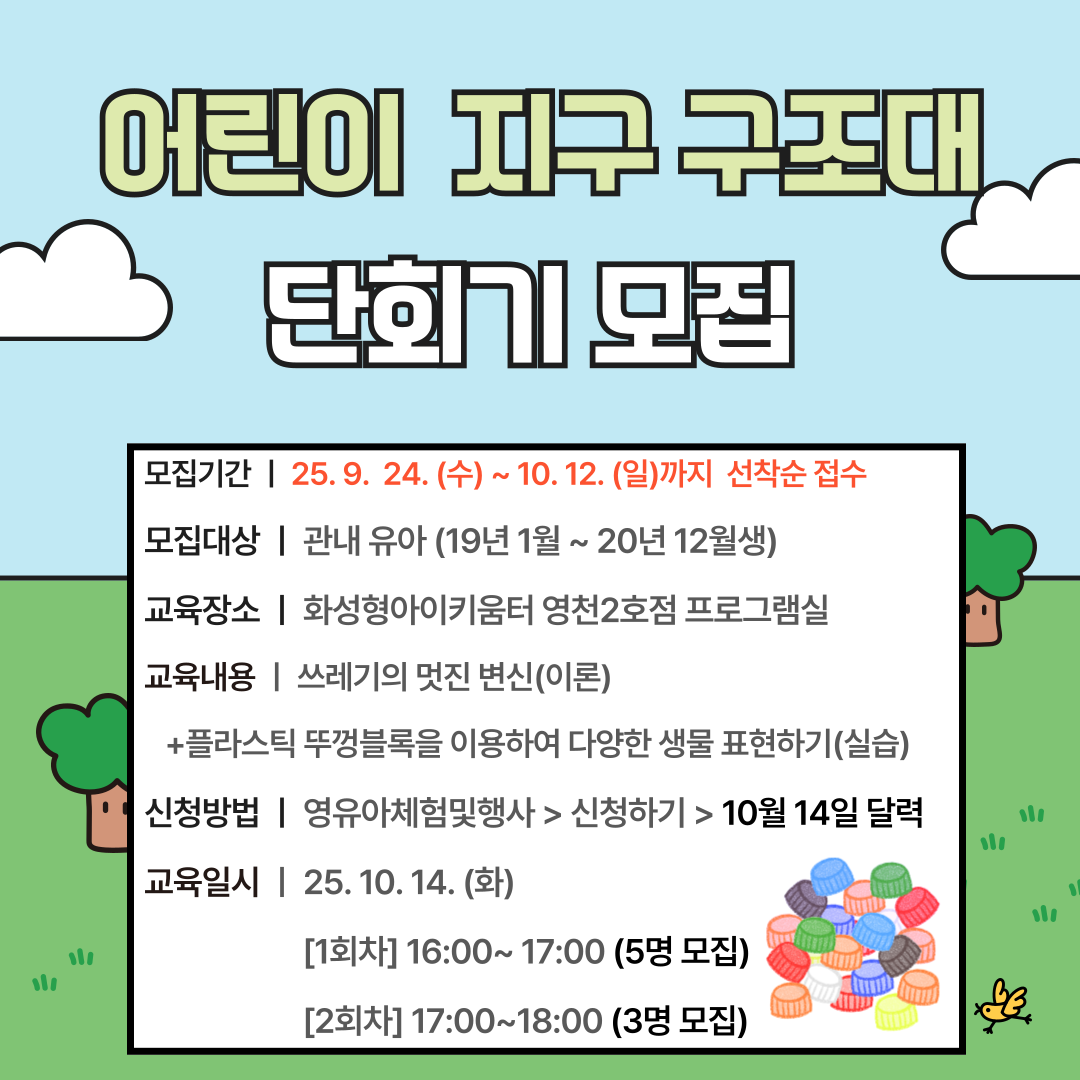 - 단회기로 1회만 참여 하는 프로그램입니다. - 어린이 지구 구조대는 유아(2019년 1월 ~ 2020년 12월)를 대상으로 진행합니다. - 양육자와 분리되어 유아만 활동이 진행되며, 분리가 가능한 유아만 신청 부탁드립니다. |
