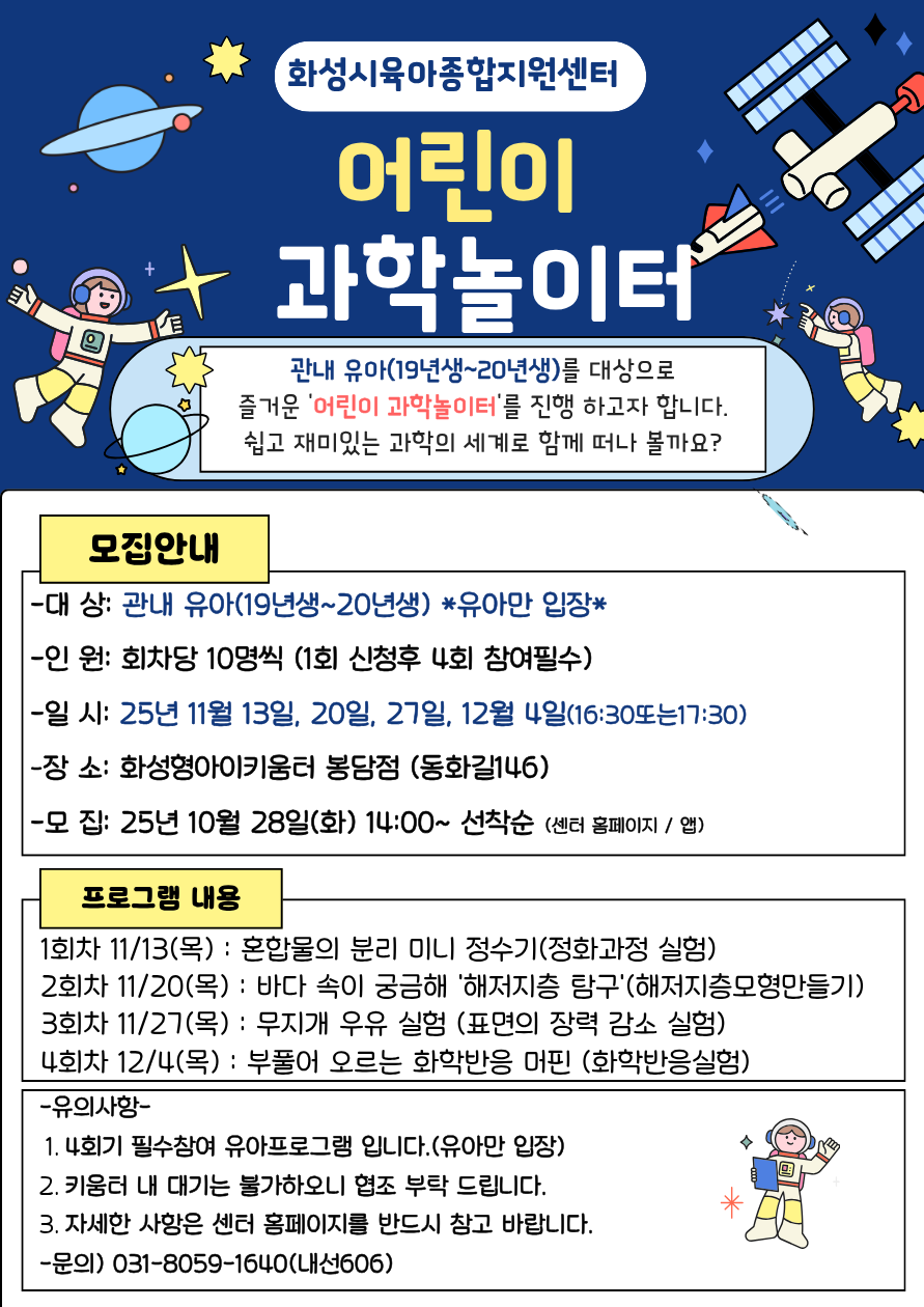 - 어린이 과학 놀이터 유아(2019년 1월 ~ 2020년 12월)를 대상으로 진행합니다. - 다회기 연속 활동입니다. (한 번 신청으로 모든 활동 참여) - 양육자와 분리되어 유아만 활동이 진행되며, 분리가 가능한 유아만 신청 부탁드립니다. - 총 4회기 진행하는 프로젝트 활동입니다. 모든 회기에 참여할 수 있는 유아만 신청 부탁드립니다. - 상반기 어린이 과학 놀이터 참여했던 유아들은 신청인원 미달 시 신청 가능합니다. *참여혜택 : 어린이과학놀이터 프로그램 가방(교육중활용), 교육재료, 교육간식 지원 등* |