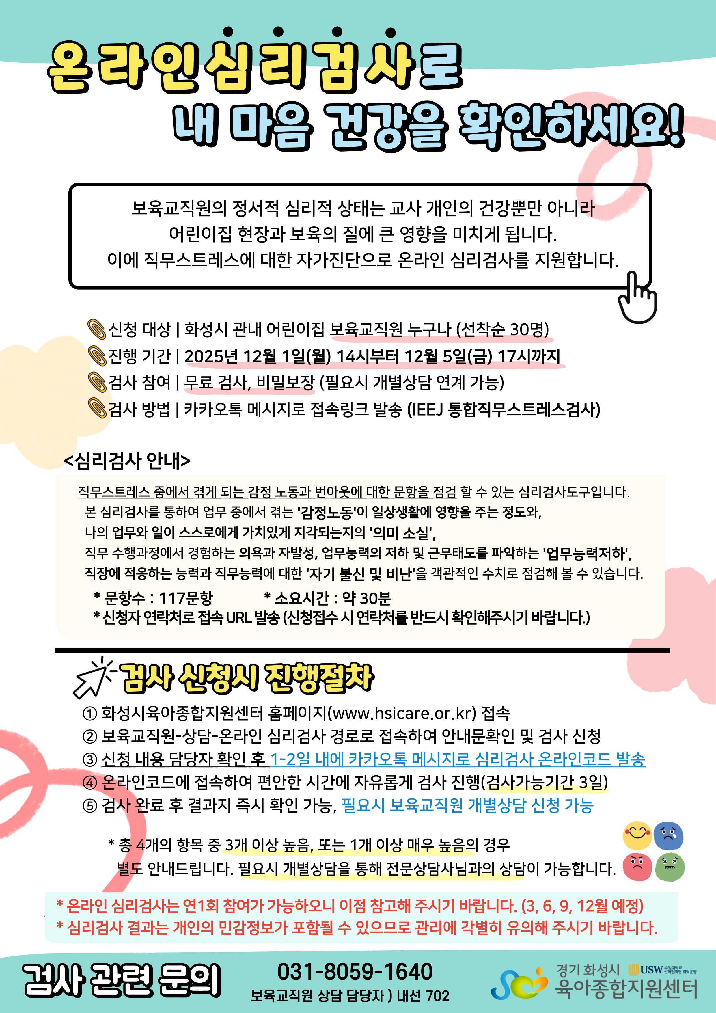 * 카카오톡 메시지로 심리검사 URL을 보내드리오니 신청시 연락처를 정확하게 기록해 주시기 바랍니다. * 메시지 수신일로부터 3일 동안 검사에 참여할 수 있으며 기간 경과시 취소됩니다. * 검사 참여 취소를 원하시는 경우 유선문의바랍니다. |