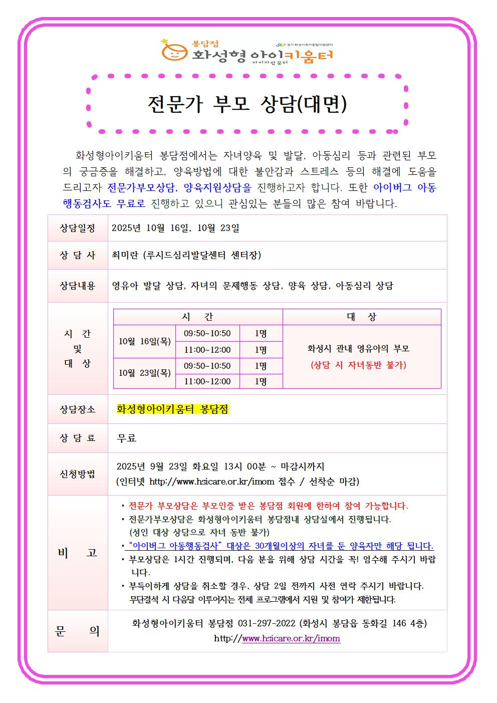 대상 | 영유아발달상담, 자녀의 문제행동상담, 양육상담, 아동심리 |
