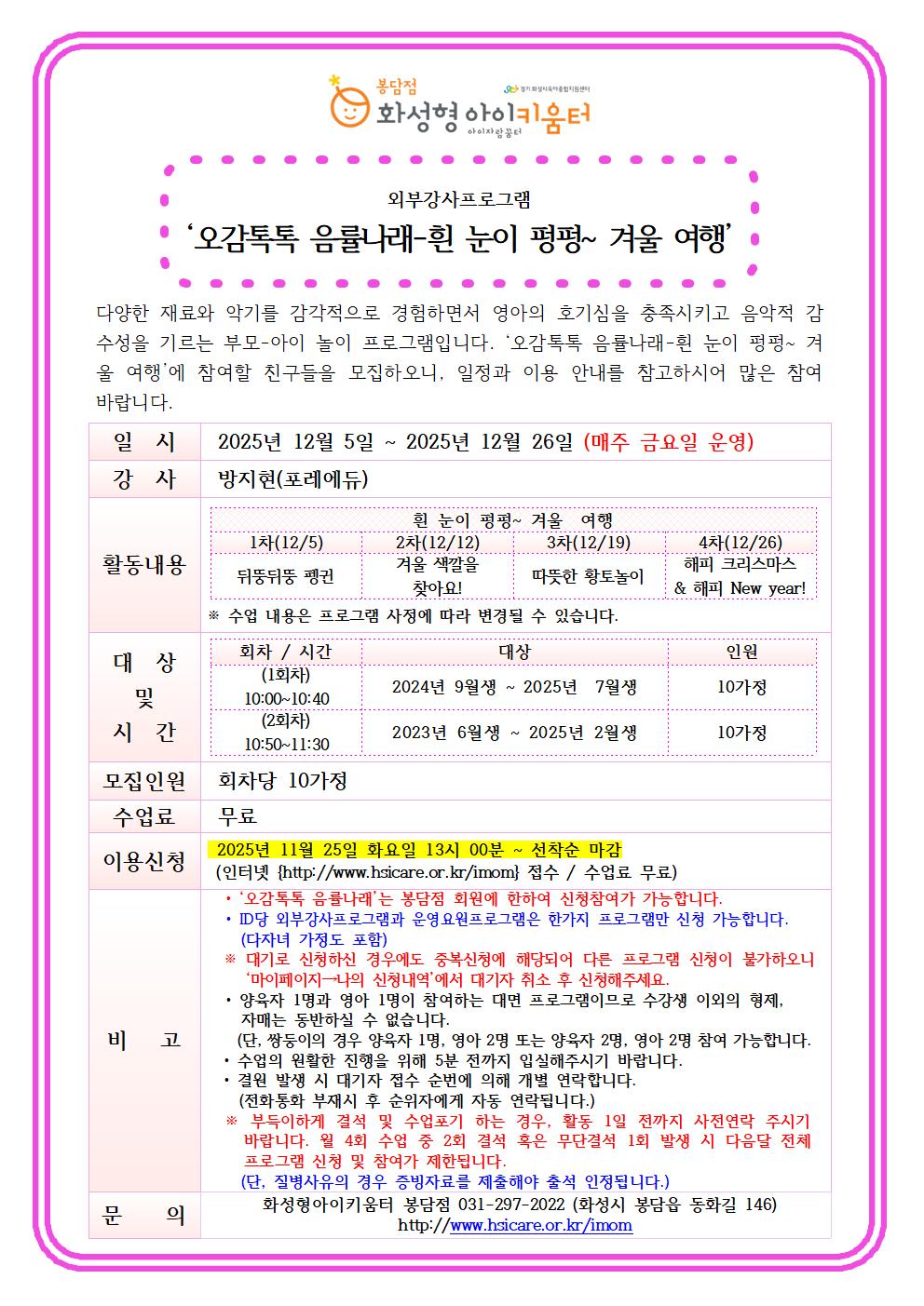 * 화성형아이키움터 봉담점 프로그램은 부모인증 받은 봉담점 회원에 한하여 참여 가능합니다.