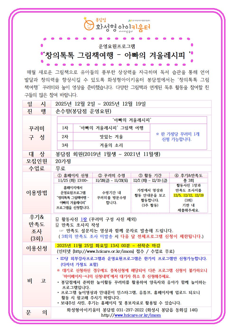 *  화성형아이키움터 봉담점 프로그램은 부모인증 받은 봉담점 회원에 한하여 참여 가능합니다.